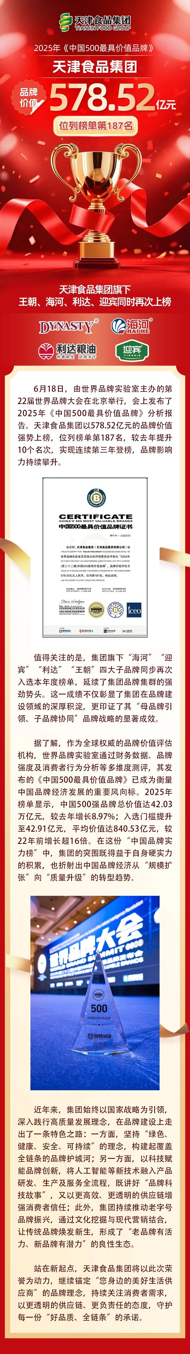 集團連續(xù)三年榮登“中國500最具價值品牌”榜單 旗下王朝、海河、利達(dá)、迎賓再次同時上榜