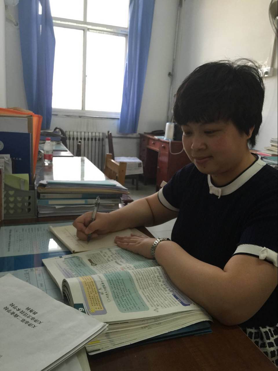 “欲影正者端其表,欲下廉者先其身”。作為一名基層黨支部書記,她深刻地體會到一名黨務工作者的一言一行在群眾眼中是何等重要;作為一名教師,她深知自己的一言一行又會對學生產(chǎn)生怎樣的影響。她曾說過:“我要對自己高標準,嚴要求,不干則已,干就干好”。支部工作中,她認真貫徹落實黨的路線方針政策和上級黨組織的決議決定,以日常教育教學工作促黨建,以提高隊伍素質為重點,以強化管理為手段,抓好思想政治工作,加強自身的道德品質修養(yǎng),努力發(fā)揮好共產(chǎn)黨員先鋒模范的作用。除了支部書記和教研室主任工作以外,她每周還承擔著20多節(jié)德育課的教學任務,面對如此繁重的工作,她從不抱怨,更從不耽誤,均能按時按質完成各項工作。她家住塘沽,每天上下班路途遙遠,但她從不搞特殊,嚴格按照學校各項規(guī)章制度辦事。
