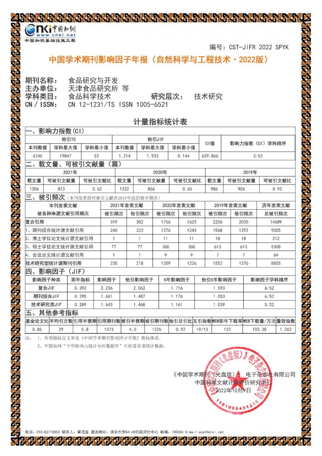 日前,中國學術期刊(光盤版)電子雜志社有限公司、中國科學文獻計量評價研究中心編制出版的《中國學術期刊影響因子年報(自然科學與工程技術·2022版)》正式發(fā)布。食品集團主管,天津市食品研究所主辦的期刊《食品研究與開發(fā)》的影響力指數(shù)穩(wěn)居本學科第三位。
