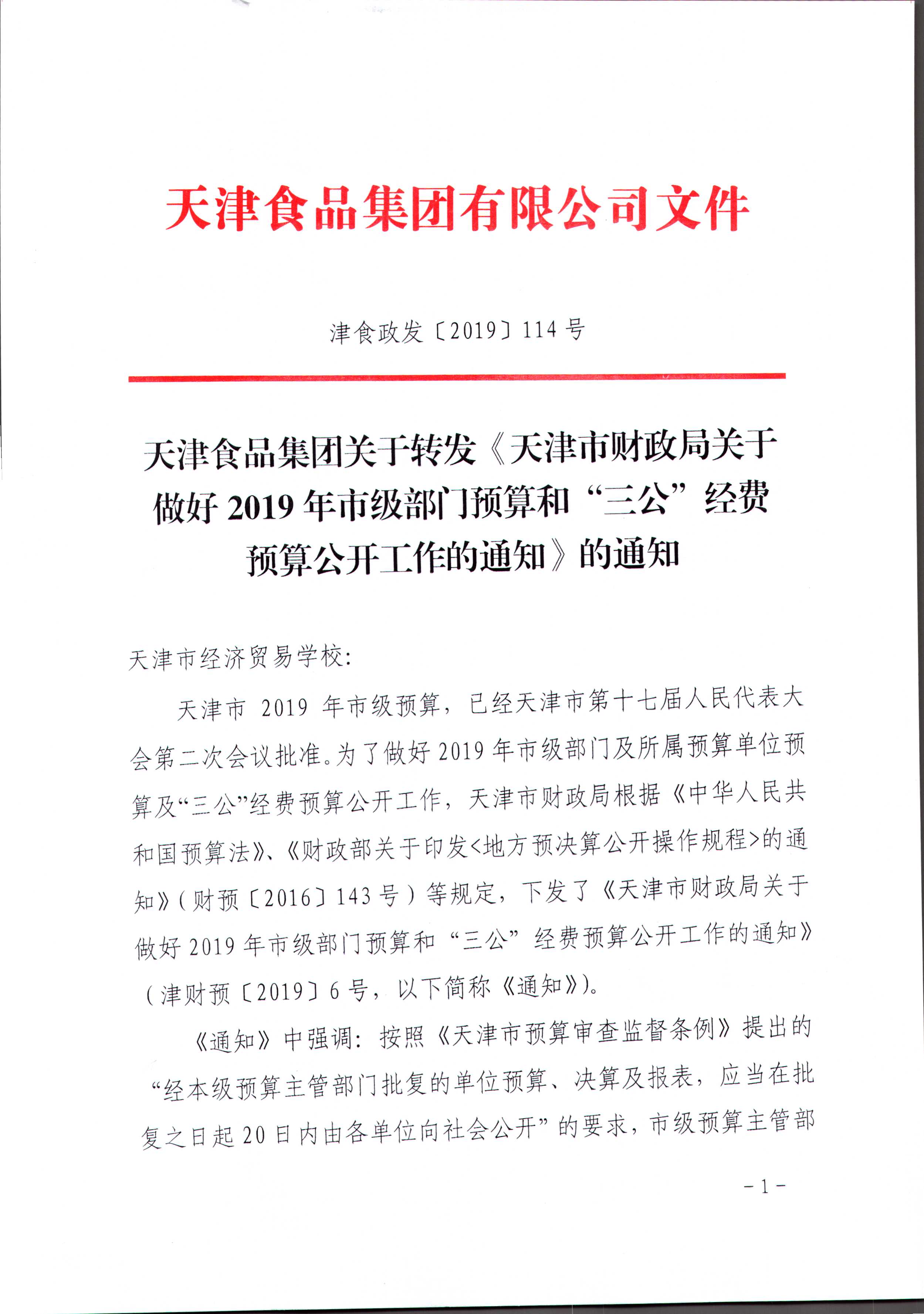 天津食品集團(tuán)關(guān)于轉(zhuǎn)發(fā)《天津市財(cái)政局關(guān)于做好2019年市級(jí)部門預(yù)算和“三公”經(jīng)費(fèi)預(yù)算公開工作的通